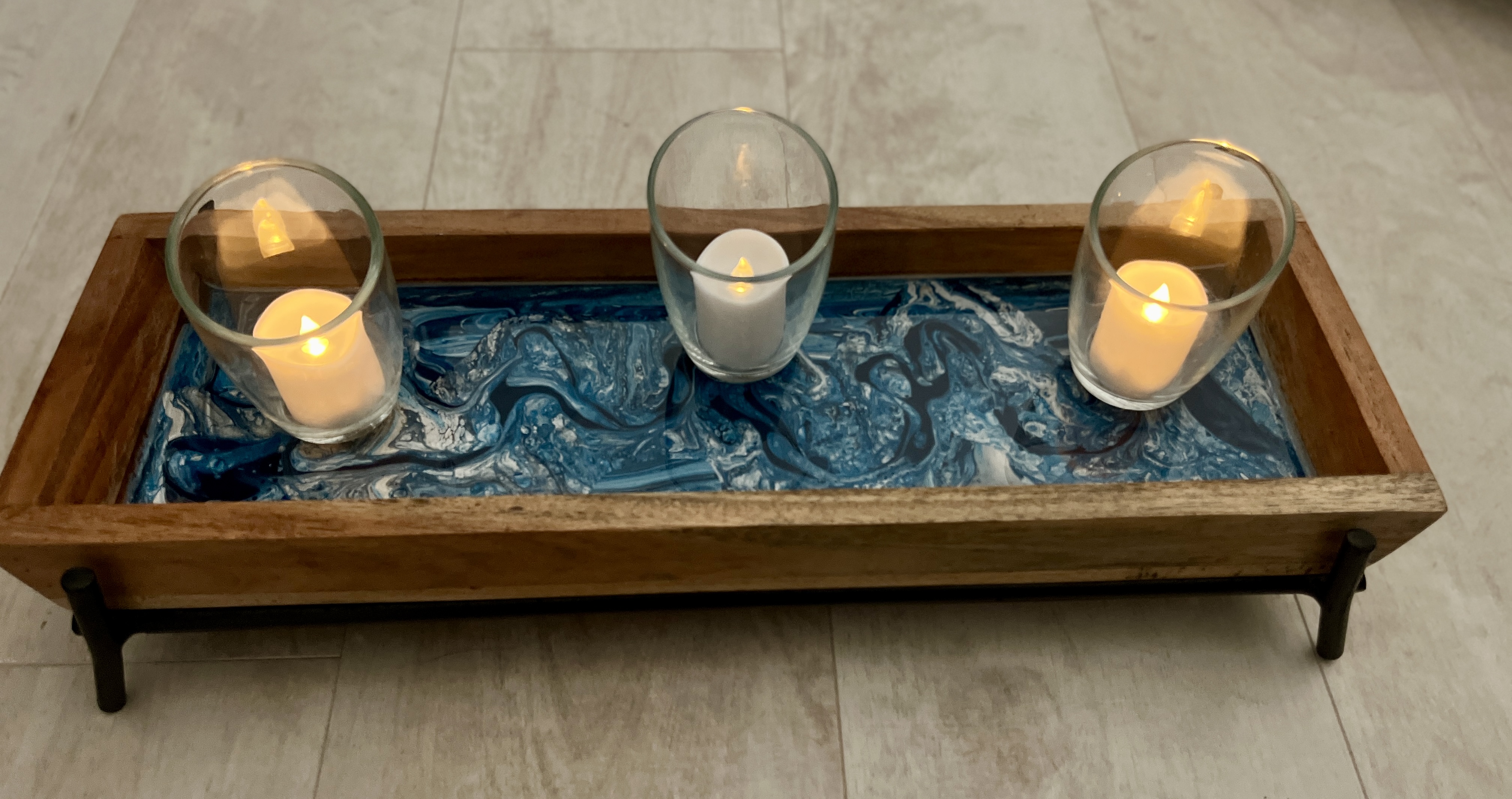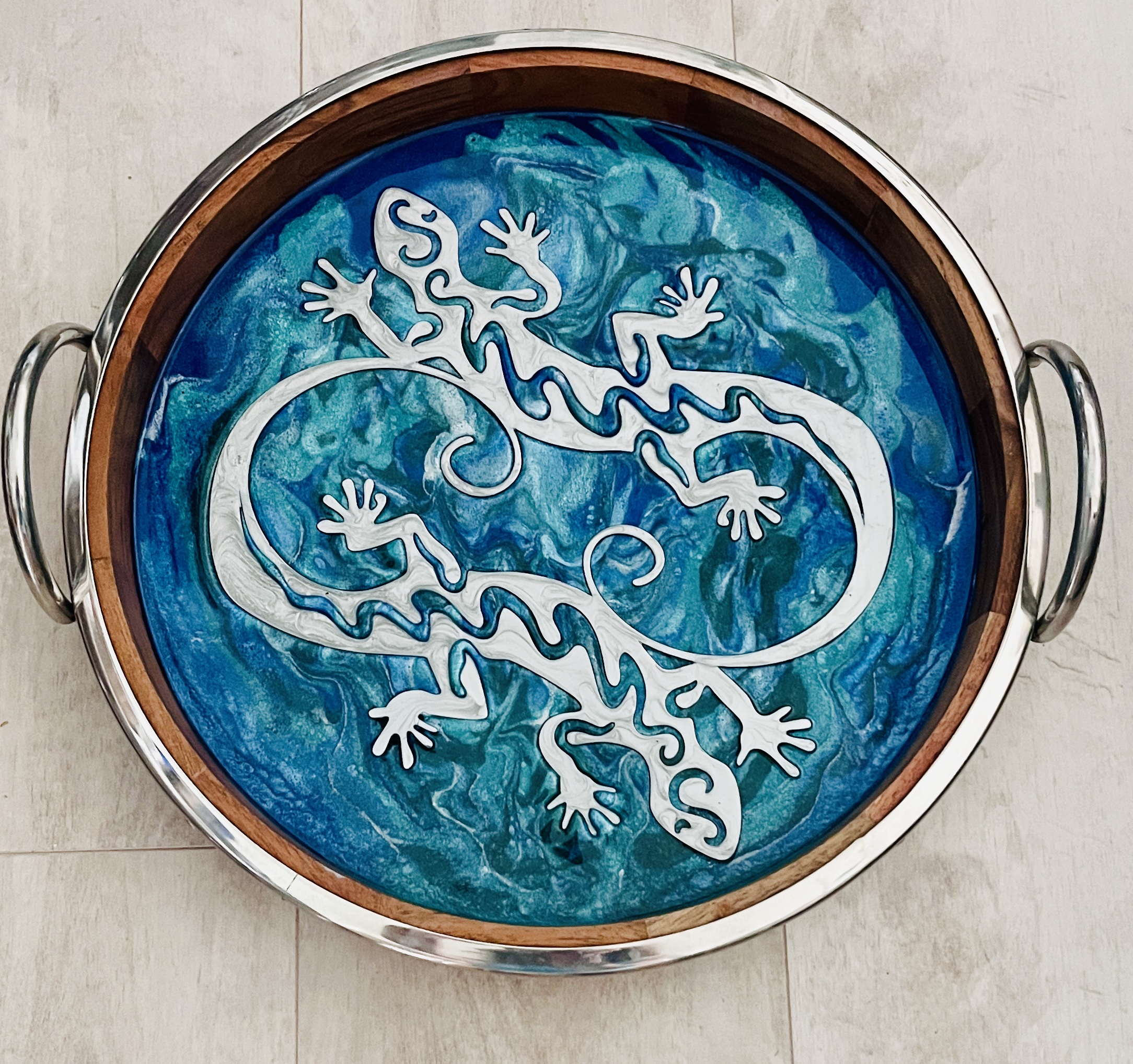 Using acrylic paint, resin, mica, and/or alcohol ink, I create wine glasses, charcuterie boards, serving trays, and wall decor. |